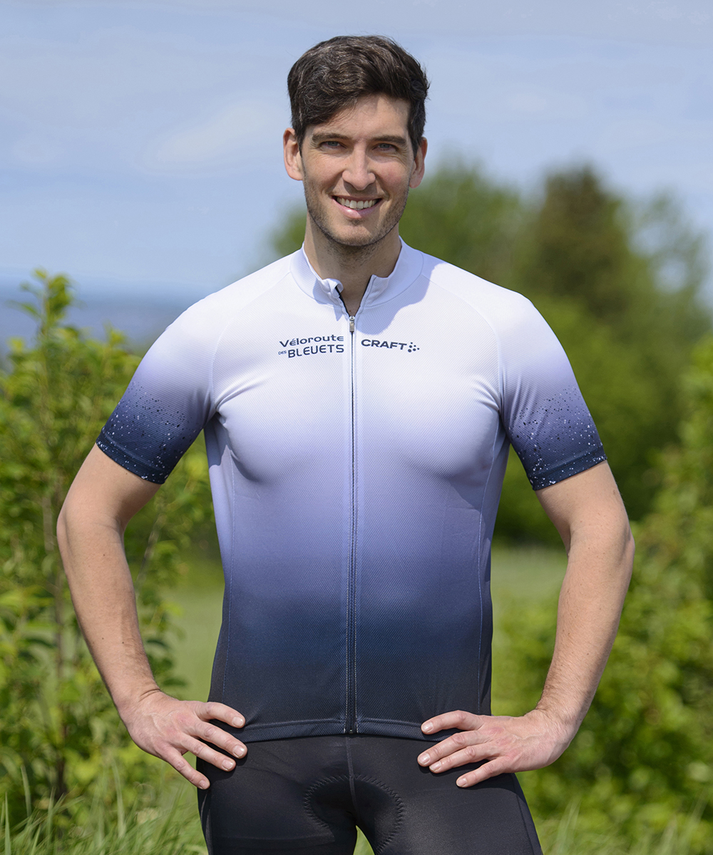 Maillot de vélo classique faire de tissus extensibles et respirants, fermoir pleine longueur.